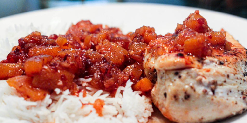 With fresh peaches, we made chutney in jam cycle of our bread maker, then grilled chicken breast, steamed jasmine rice and covered it all in glorious peach chutney.